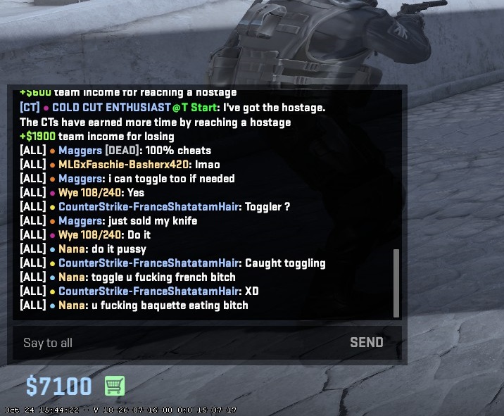 - “Toggle” : J’ai joué avec des américains et ils arrêtaient pas de crier au togglage quand quelqu’un en face avait un problème de connexion. Je leur ai demandé ce que ça voulait dire, et ils m’ont répondu que “Toggle” voulait dire “cheat”. Sauf que ça colle pas, car quand on cheat d’habitude on écrit dans la console “god” ou “noclip”, mais jamais Toggle, alors j’imagine qu’ils disaient de la merde ou alors c’est moi le con.